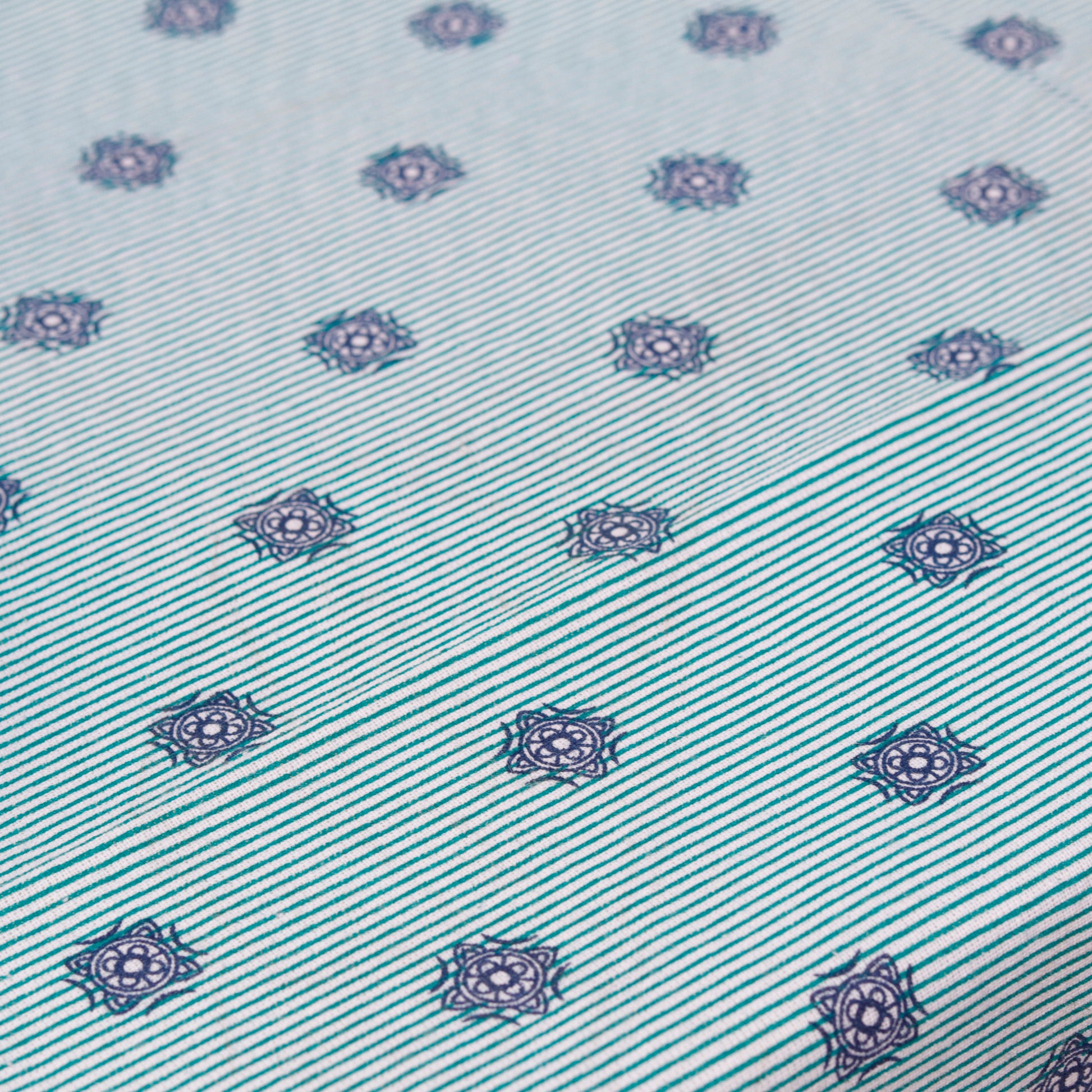 Teal and white striped base with intricate block-style motifs
