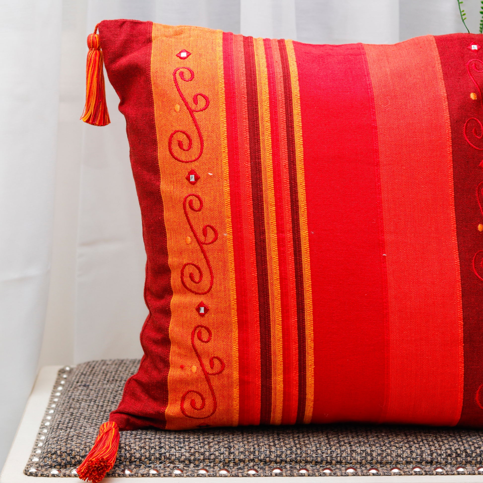 Infuse your living space with vibrant color and rich texture using the Bohemian Sunset Tassel Cushion Cover. This stunning piece features a bold, woven pattern of vertical stripes in warm, fiery tones of red, burnt orange, and gold. The design is elegantly finished with detailed, contrasting swirl embroidery and playful tassels at each corner, making it a perfect accent for bohemian, global, or maximalist decor. It’s an instant warmth and energy boost for any sofa or chair.