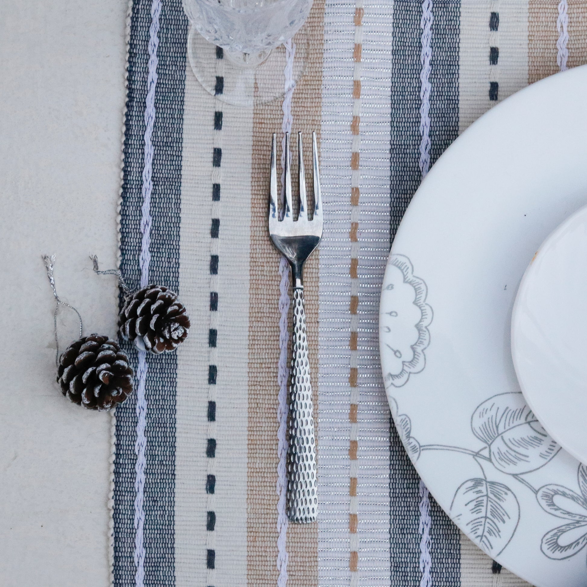 The hand-woven look includes subtle dash-stitch details that add unique texture and craftsmanship. Perfect for casual family dinners or for creating a beautiful, layered tablescape for entertaining. Its neutral colors make it versatile enough to pair with both patterned and solid dinnerware year-round.