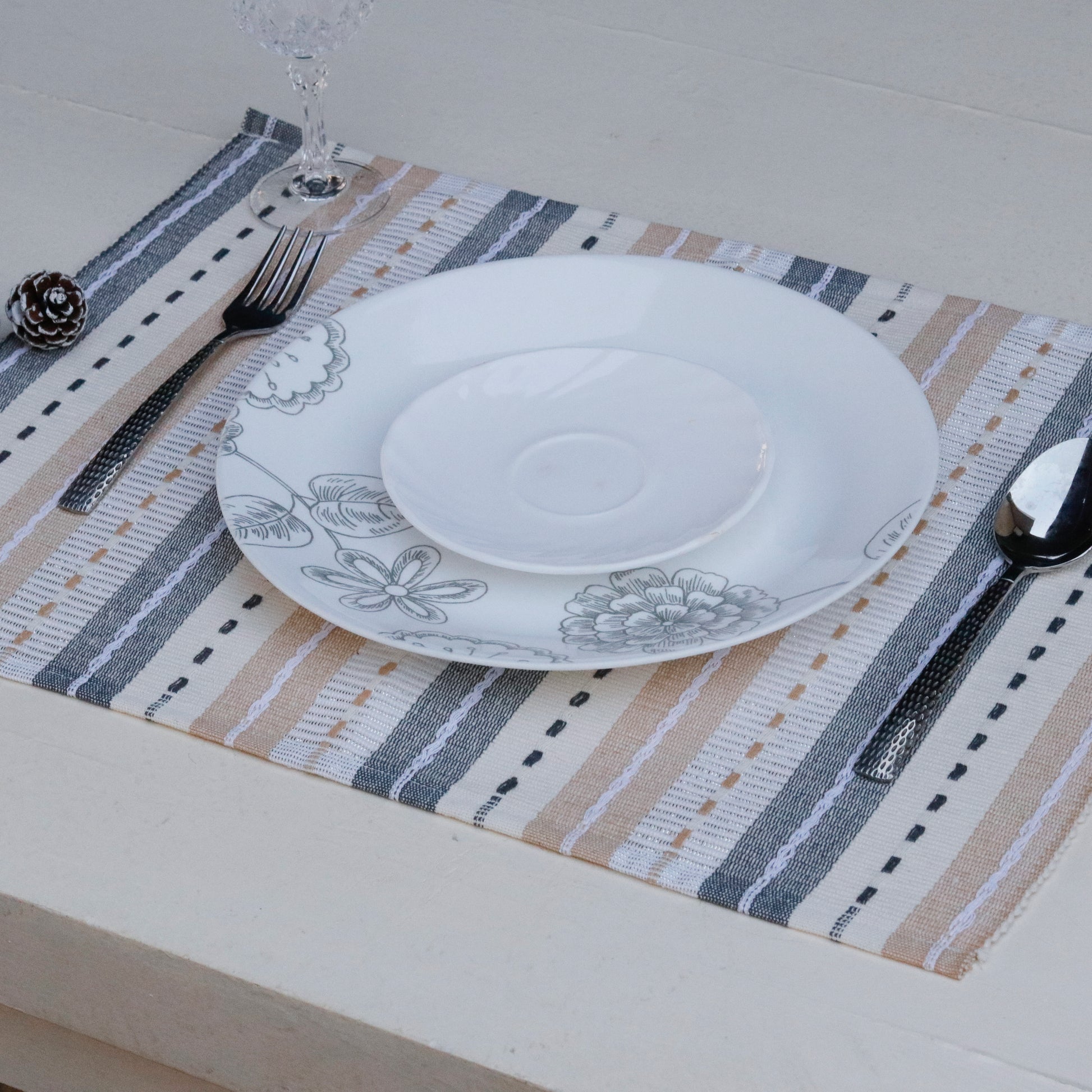 Elevate your dining table with the understated elegance of this woven placemat. Featuring a contemporary pattern of vertical stripes in a soothing palette of beige, grey, and cream/white, this placemat effortlessly blends rustic charm with modern design.