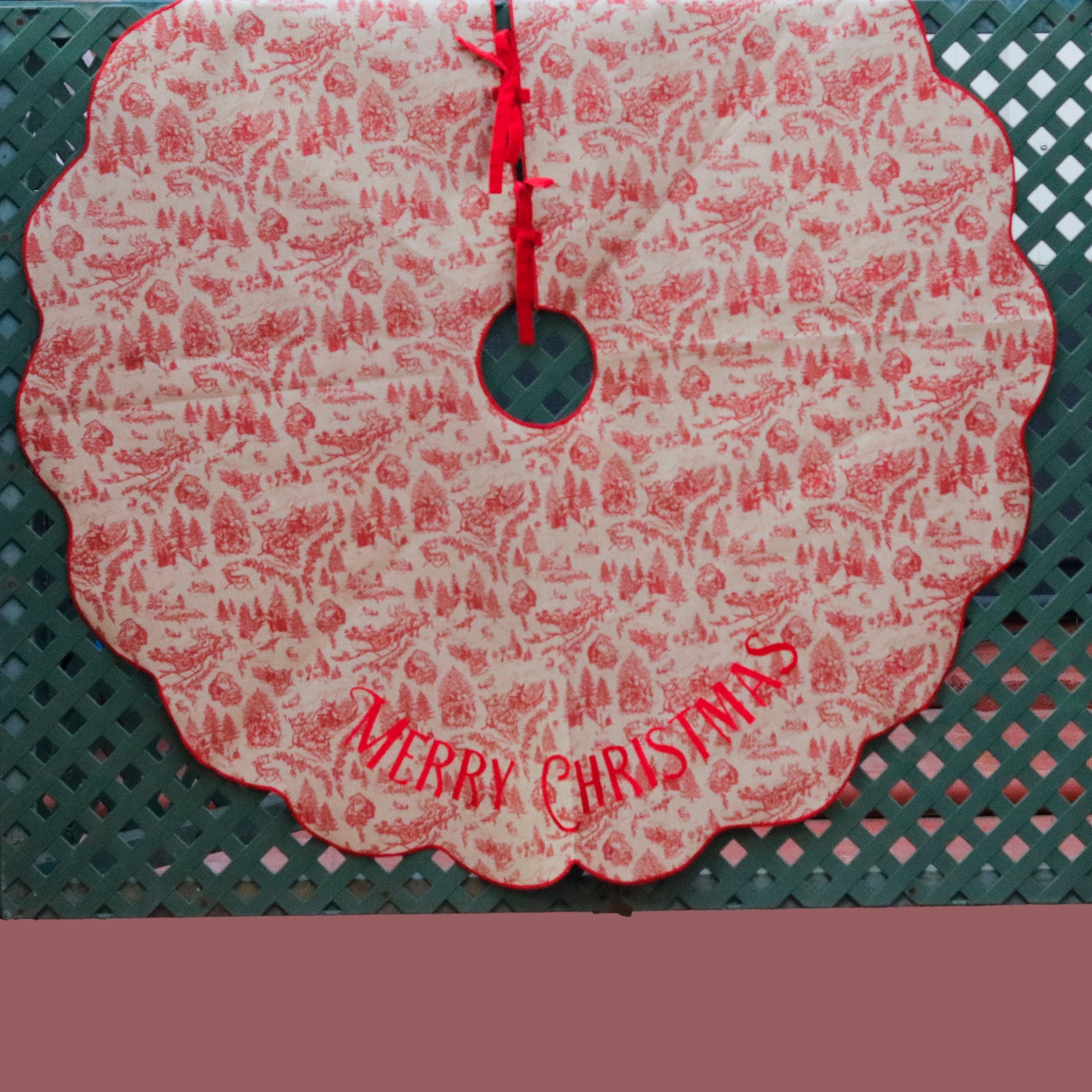 Finish your holiday display with the timeless charm of the Red Toile Scalloped Tree Skirt. This round tree skirt features a classic red toile pattern depicting festive woodland and village scenes, printed on a natural linen-look background. The edge is beautifully finished with a scalloped red border, and the phrase "Merry Christmas" is embroidered prominently across the front, adding a touch of personalized warmth. It ties securely at the top to fit perfectly around the base of your tree.